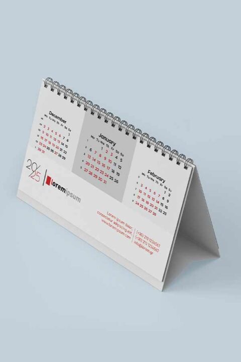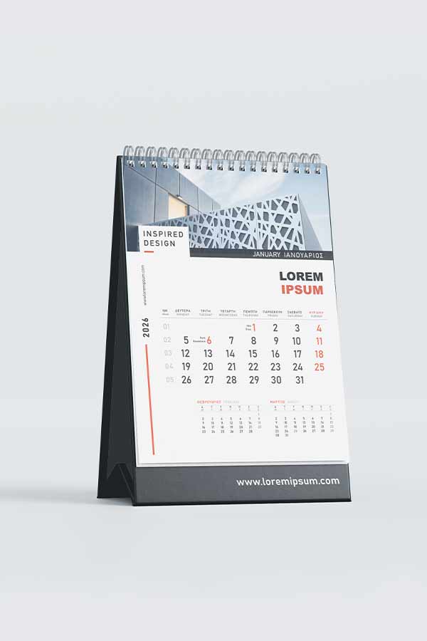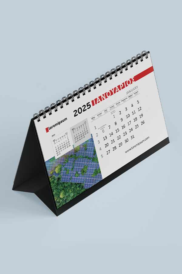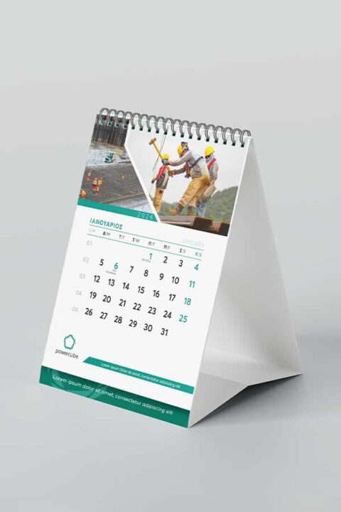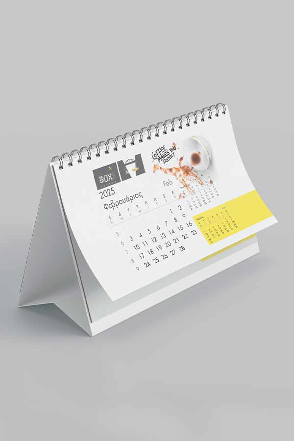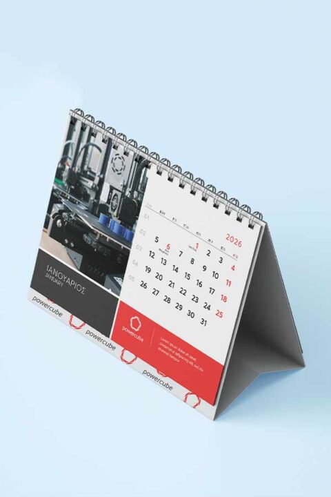 Μηνιαίο ημερολόγιο πυραμίδα με spiral βιβλιοδεσία, πλήρως προσαρμοσμένο στα εταιρικά σας χρώματα, ταυτότητα και φωτογραφικό υλικό. Διαθέσιμο σε ποικιλία διαστάσεων και σε διαφορετικές επιλογές βάσεων στήριξης.
